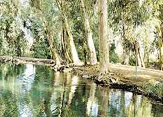 הזורמים ממשיכים אל בריכה נקייה ויפה, בצל העצים הגבוהים. בלב הבריכה מבנה ישן,